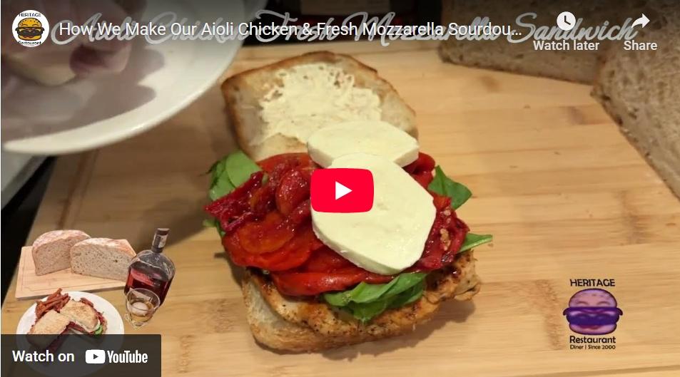 Grilled chicken meets creamy garlic aioli, fresh baby spinach, roasted red peppers, sun dried tomato, and molten mozzarella—stacked on toasted sourdough and paired with a pour of Woodford Reserve Straight Kentucky Bourbon. This video takes you behind the scenes at Heritage, where every sandwich is built with intention and flavor. Watch the craft. Taste the story.