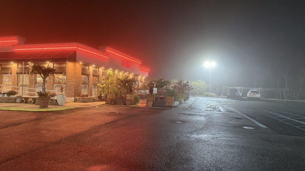 The neon lights—usually just a warm welcome—became something more. They sliced through the fog, casting reflections across the wet pavement and turning the diner into a glowing beacon in the haze.