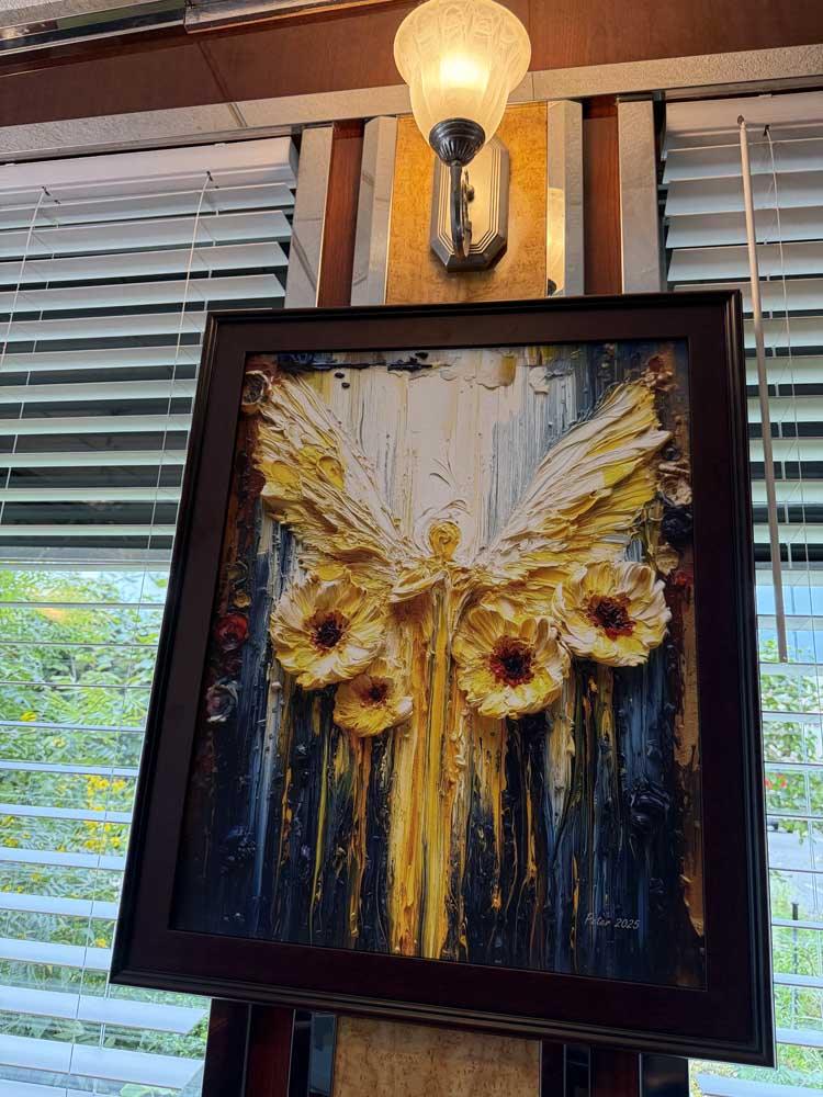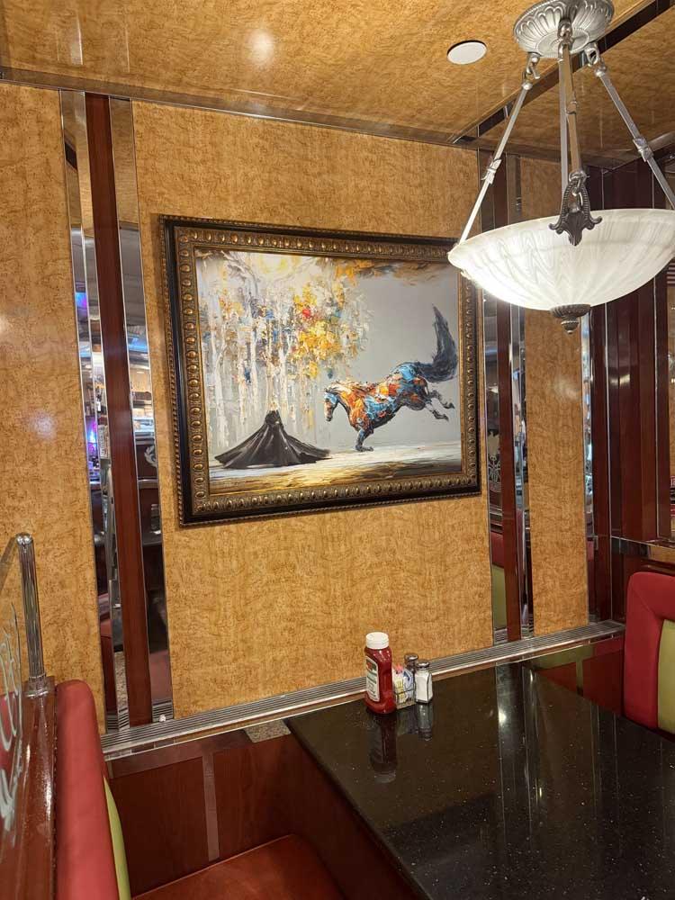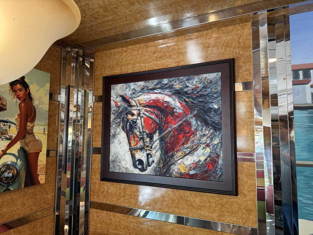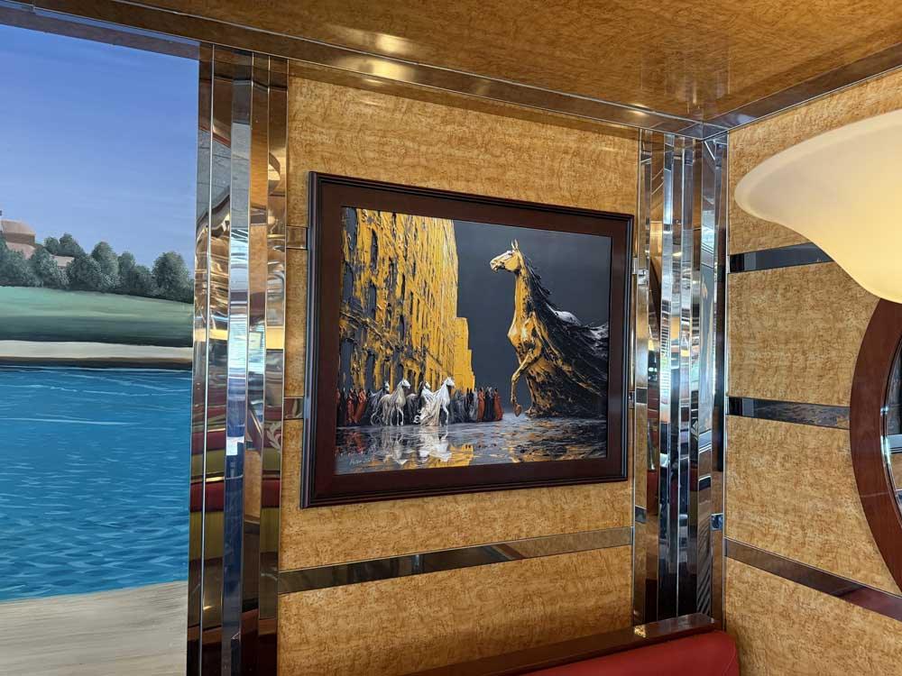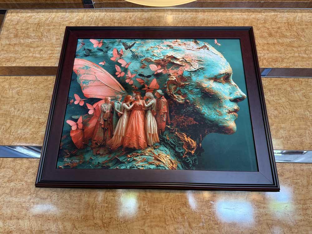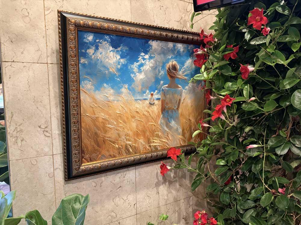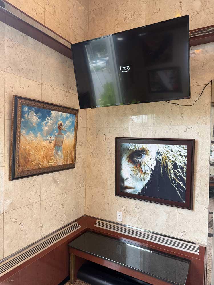 We collaborate with you on theme and direction, then handle every step: from crafting the artwork to pigment-based giclée printing, building your selected frame style (wood museum frame, glass-mounted panel, or stretched canvas), and professionally hanging the finished pieces at your location.